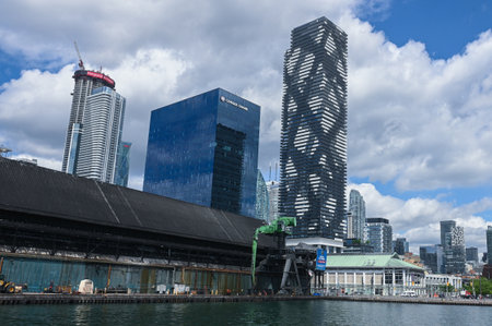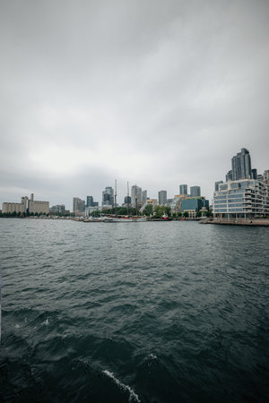 Toronto, Canada - AUG 4, 2019: City skyscrapers seen from Harbour Front marina area at Toronto, Ontario, Canada