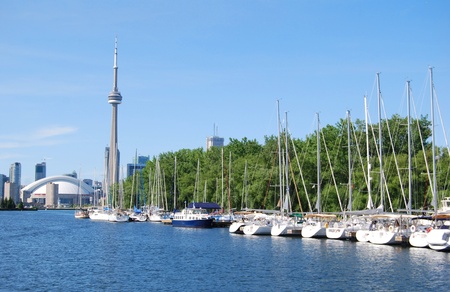 TORONTO, CANADA - SEPTEMBER 19, 2018: Marina at Toronto Island, and beautiful Toronto's skyline over lake. Toronto, Ontario, Canada.