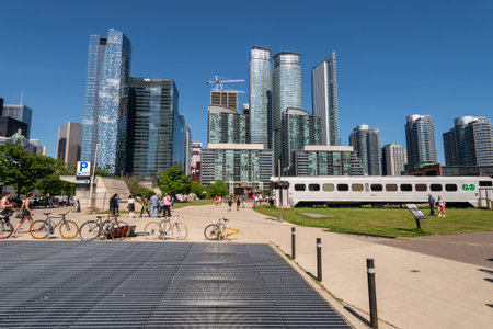 Toronto,Canada-august 2,2015:people visit the Toronto's railway heritage center with a view of skyscrapers during a sunny day