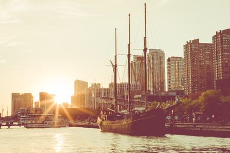 TORONTO, CANADA - SEPTEMBER 18, 2018: Sunset at the Ontario lake with tall ship standing at marina in Toronto, Canada.