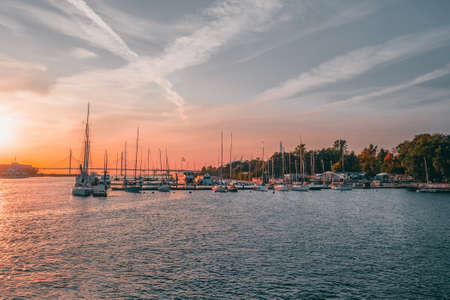 Motor and sailing yachts are moored in the marina of the yacht club. Saint-Petersburg. Russia.