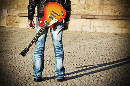 back view of a guitarist standing with a guitar. Vintage effect.