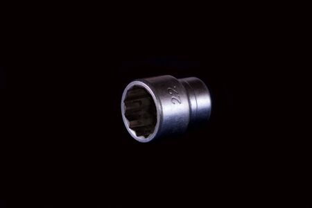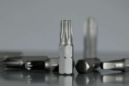 Set of screwdriver bits. Replaceable screwdriver bits are visible on a grey background.