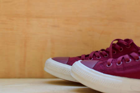 Close up a red sneakers isolated on wooden background. Put your text design