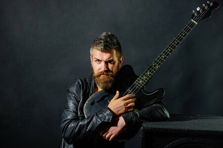 Guitar player in jacket with electric guitar. Music hobby. Fashionable guitarist with classic instrument. Bearded man with guitar. Concert tour. Rock or punk music concert. Attractive man with guitar