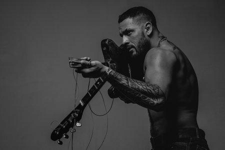 Party for adults. Music dance party. Move your body. Enjoy perfect sound. Rock musician concept. Muscular athletic sexy male with guitar. Rock this party. Confident and handsome brutal man play music