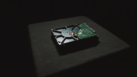 The underside of an Hard disk drive in dark room on gray textile surface.