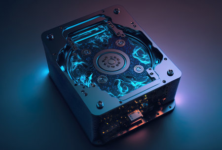 Close up of Computer Processor with opened Hard Drive on Black Reflective Background