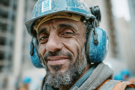 Confident African American construction worker with hard hat and ear protection smiles at camera, embodying professionalism and dedication in a bustling construction environment