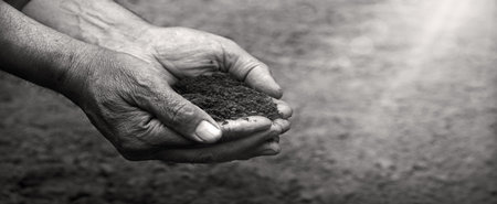 A close-up shot features hands cradling a mound of dark, rich soil, emphasizing its texture and potential for growth. A symbol of the earth's fertility and agricultural practices.