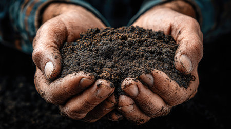AI Generated. two dirty hands holding a pile of dark rich soil symbolizing farming nature and growth in an earthy outdoor setting