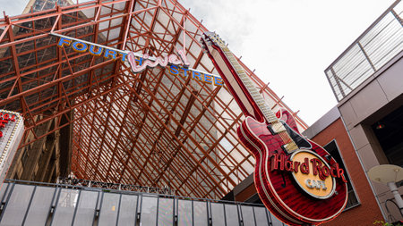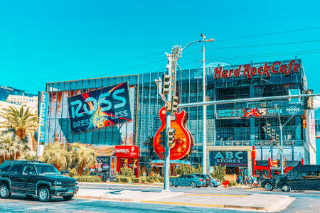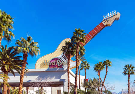 LAS VEGAS, NEVADA - JULY 25, 2017: View of The Hard Rock Cafe on the Strip. The Hard Rock Sign is embedded in a Gibson Les Paul Guitar III in Las Vegas on July 25, 2017.
