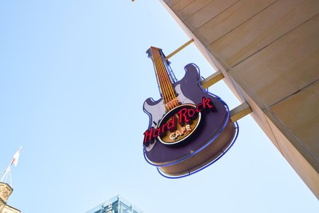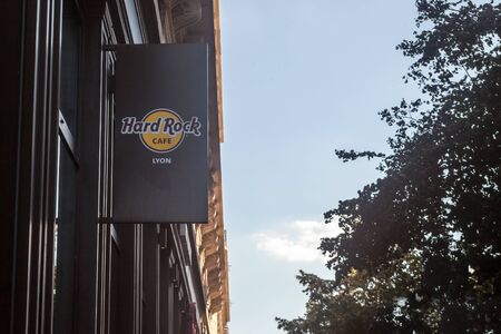 LYON, FRANCE - JULY 13, 2019: Hard Rock Cafe logo on their restaurant in Lyon. Hard Rock Cafe is a chain of American music theme restaurants spread worldwide