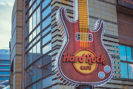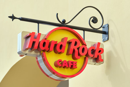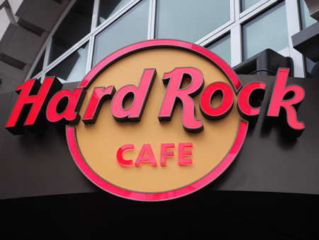 COLOGNE, GERMANY - CIRCA SEPTEMBER, 2018: close up shot of Hard Rock Cafe sign. Hard Rock Cafe Inc. is a chain of theme restaurants.