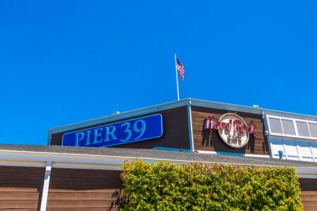 San Francisco, USA - August 2019: Hard Rock Cafe sign on Fishermans Wharf on a summer day