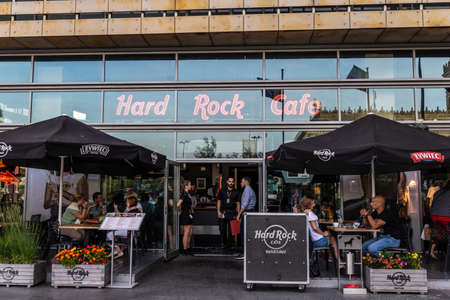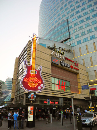 Warsaw, Poland - June 28, 2016: People near the Hard Rock Cafe in Warsaw. Hard Rock Cafe in Warsaw.