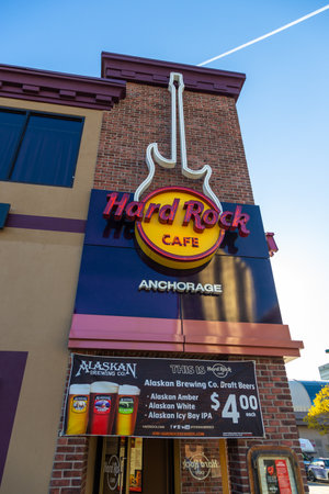 Anchorage, Alaska, USA - September 30, 2016: A view of the Hard Rock Cafe Anchorage, a popular chain restaurant in downtown Anchorage. Sunny evening.