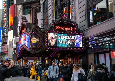New York City, United States - November 17 2018: Crowds pass the entrance to the Hard Rock Cafe restaurant on Broadway
