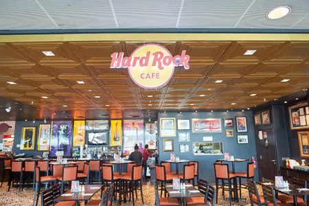 DUBAI, UNITED ARAB EMIRATES - CIRCA JANUARY, 2019: interior shot of Hard Rock Cafe at Dubai International Airport.