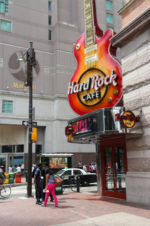 PHILADELPHIA - JUNE 11: People walk past Hard Rock Cafe on June 11, 2013 in Philadelphia. There are 175 Hard Rock locations in 53 countries.