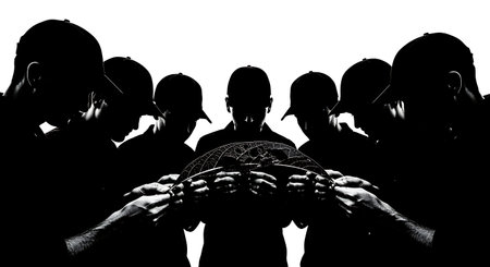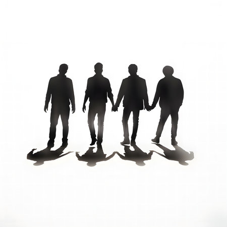 Four men walking in silhouette with hands held, against a white background, conveying the theme of friendship, brotherhood, and unity.