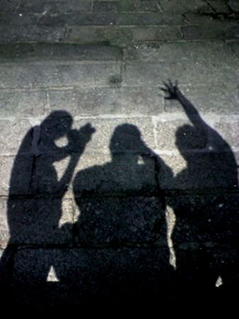 Two individuals are positioned in a striking light, casting long shadows on a textured surface.