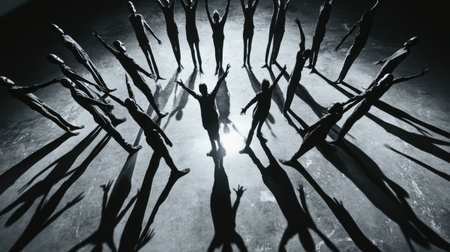 This artistic black and white photo captures a group of dancers creating dynamic silhouettes on a floor, emphasizing movement and emotional expression.