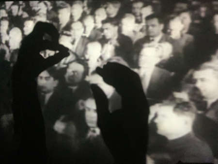 play of shadows on the screen. Finger shadow figures on the wall. People are fooling around in the cinema. Black white cinema.