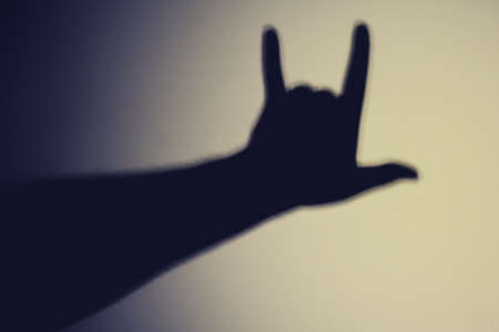 Shadow of a hand from the night light of a flashlight on a white wall. Dark silhouette of a man hands from the light of a lamp