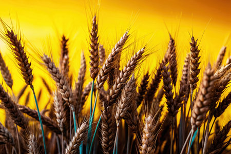 Ripe wheat spikelets close up on a yellow background