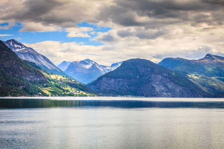 Tourism vacation and travel. Mountains landscape and fjord in Norway Scandinavia Europe. Norddalsfjorden as seen from ferry. Beautiful nature