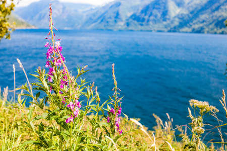 Norwegian landscape. Purple flowers rosebay willowherb on water fjord shore and mountains in the background