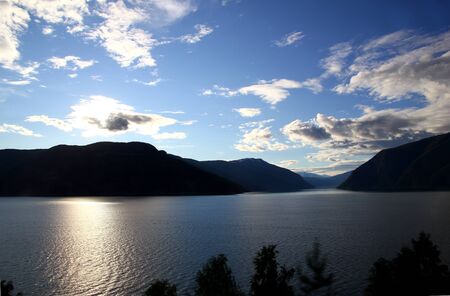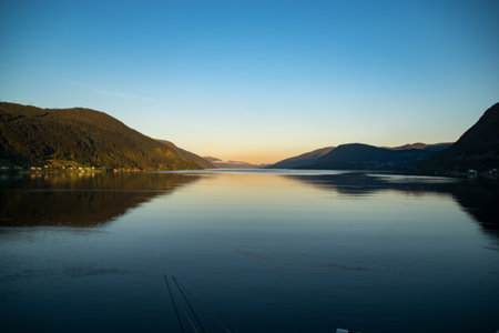 A view on the Songefjorden (King of the Fjords) from the water level. It is the deepest fjord in Norway. Tall, lush green mountains surrounding the fjord. Calm surface of the water. Clear blue sky.