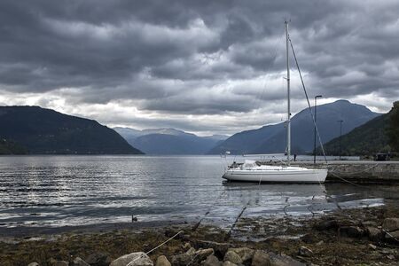 Mooring yacht in low tide in Norwegian fjord against dark cloudy sky