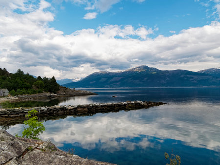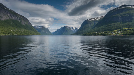 Still waters mirror the majestic Norwegian fjord surrounded by vibrant green mountains and a partly cloudy sky great for travel inspiration or landscape photography.