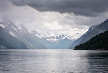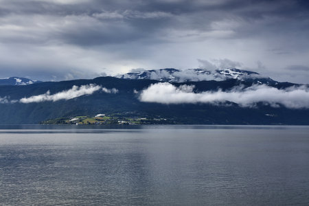 Norway fiord landscape. Sognefjord with low clouds near Vangsnes.