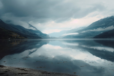 Misty fjord landscape reflecting calm waters at dawn with surrounding mountains and fog in a serene natural setting