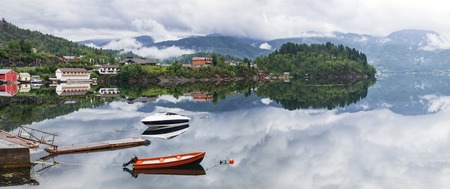 Very beautiful landscape view of the cozy little houses on the hill and the beautiful reflections in the water of the fjord in Norway in the summer