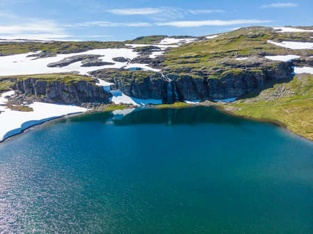 Mountain lake Flotvatnet with waterfall. Scenic region between Aurland and Laerdal in Norway. National tourist route Aurlandsfjellet.