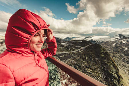 Tourist owoman standing n Dalsnibba viewpoint, Geiranger Skywalk platform, enjoying mountains view, road Nibbevegen and parking area in the background, Norway.