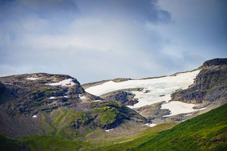 Mountain landscape in summertime with ice peaks and glacier, Norway.