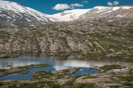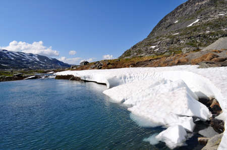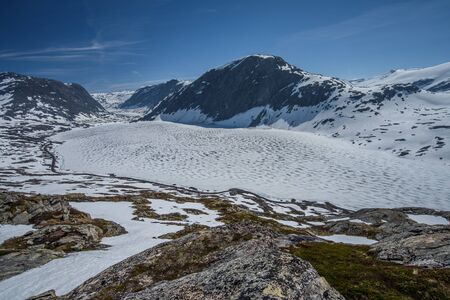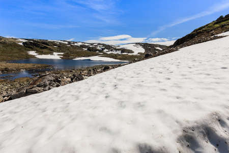 Telemark landscape in Norway. Haukelifjell mountain area. Snow in July.