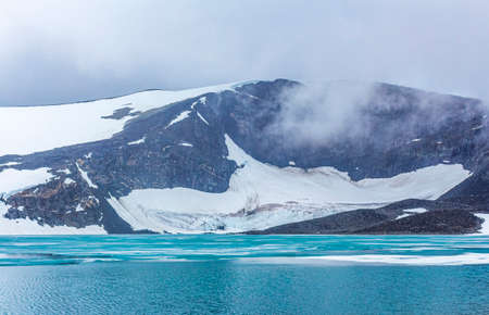 Magical places in Norway. The mountains are covered with freshly fallen snow. Summer trip to the Snow Queen. Lake Djupvatnet is covered with ice in July.