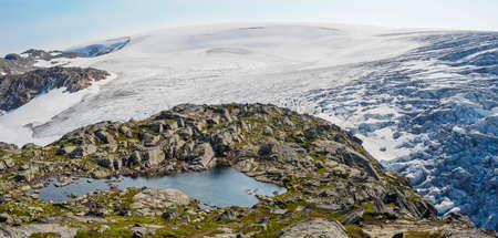View Krossbu glacier Smorstabbrean from Sognefjellshytta along National scenic route Sognefjellet between Skjolden and in Western Norway.