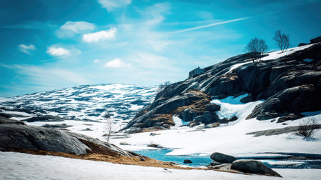 Tourism holidays and travel. Melting snow in mountains, Norway Scandinavia.