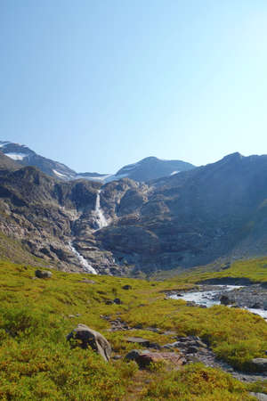 Waterfall flowing to the Reservoir Mooserboden embedded in the impressive mountains of the Hohe Tauern near Kaprun, Austria.