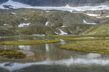 Beautiful Storebottane river by the vavatn lake with snow in the summer landscape in Hemsedal Norway.