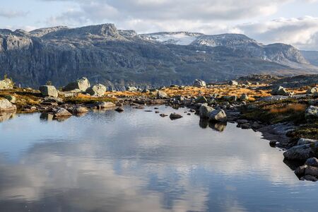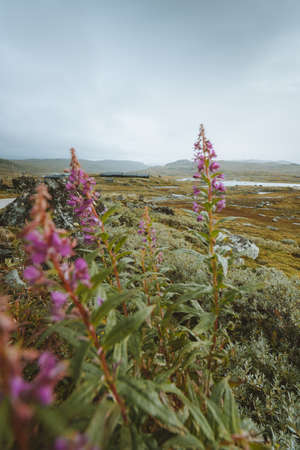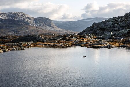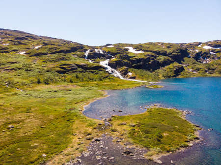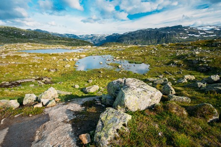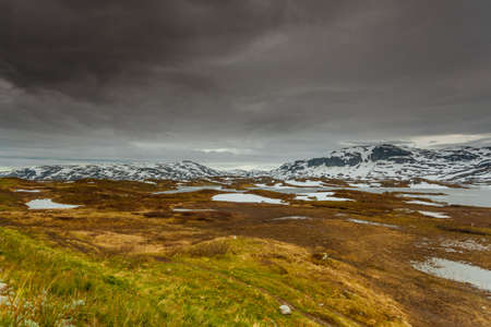 Hardangervidda mountain plateau landscape. National tourist route. Norway in summer.