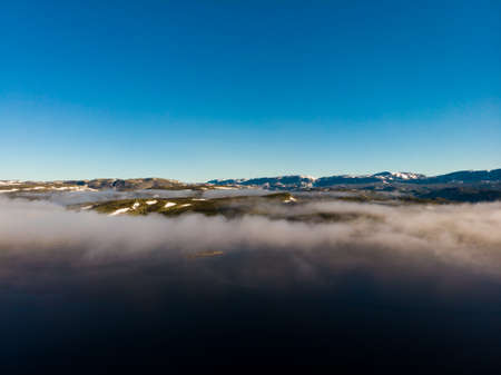 Aerial view. Norway landscape. Morning time, clouds over lake water and snowy mountains in distance. National tourist Hardangervidda route.