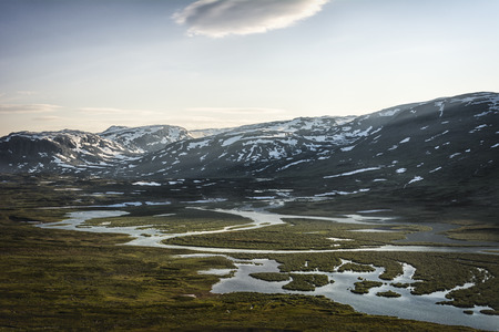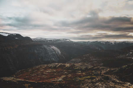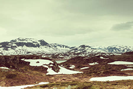 Tourism holidays and travel. Melting snow in mountains, Norway Scandinavia.